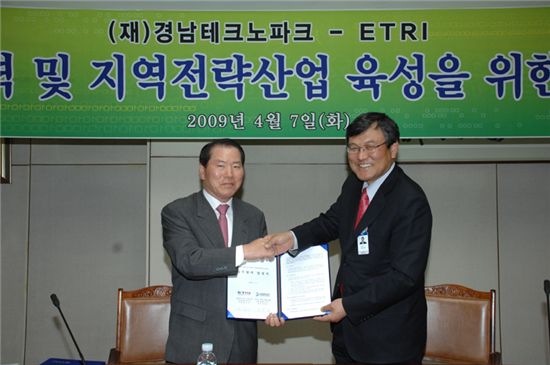 ETRI 최문기 원장(오른쪽)과 경남TP 강성준 원장이 MOU 체결후 악수하고 있다.