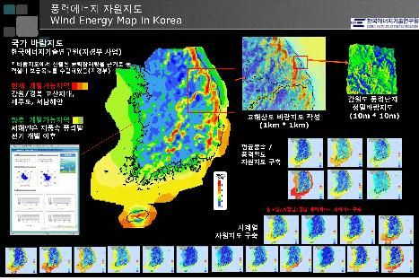 우리나라의 풍력에너지를 표현한 자원지도. 1km급 해상도로 볼 수 있어 풍력발전단지 조성에 크게 활용될 수 있다.