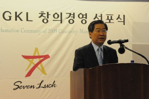 권오남 그랜드코리아레저(주) 사장이 9일 오후 세븐럭 서울강남점에서 열린 ‘창의경영 선포식’에서 인사말을 하고 있다.