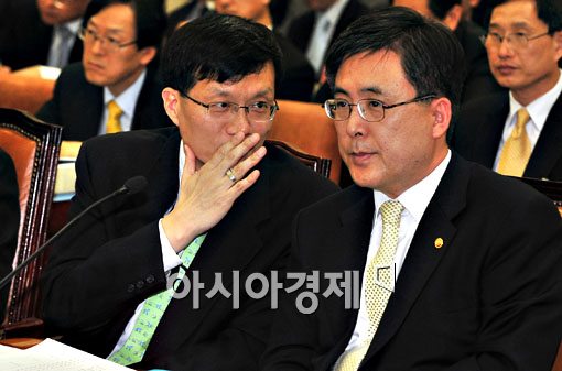 정부가 제출한 28조 9천억 원 규모의 추가경정 예산안에 대한 심의가 국회 각 상임위별로 실시된 13일 국회 정무위에 출석한 진동수(오른쪽) 금융위원장과 이창용 부위원장이 귀속말로 대화를 나누고 있다.