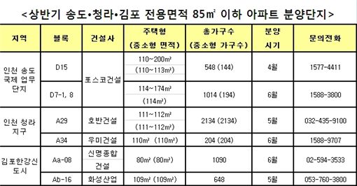 지역별로는 송도 2154가구 중 338가구, 청라 9020가구 중 2338가구, 김포 2796가구 중 1738가구가 중소형으로 상반기 분양 예정이다.