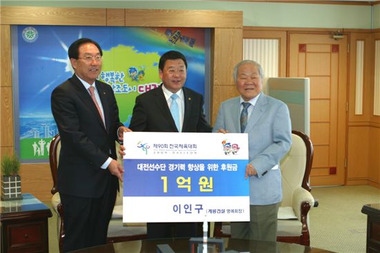 이인구 계룡건설 명예회장(오른쪽)이 오는 10월 대전서 열리는 전국체전에 참가하는 대전시 선수단의 경기력 향상과 사기를 북돋기 위해 박성효 대전시장(가운데)에게 후원금 1억원을 전했다. <사진=계룡건설>