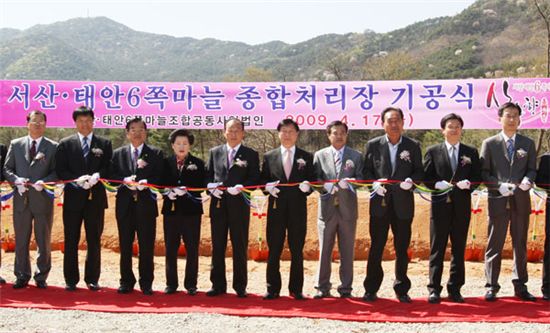 서산-태안 6쪽 마늘 종합처리장 기공식에서 관계자들이 축하테이프를 자르고 있다.