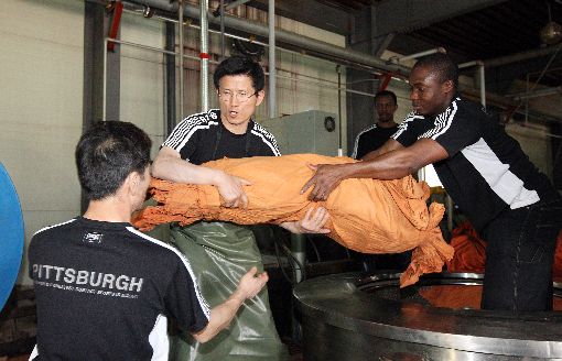 김 지사는“30년만에 다시 해보는 일”이라며 “(과거를 회상하듯)그 때 노동운동하면서 해직된 이후 처음”이라고 말했다. 본격적으로 작업장에 들어선 김 지사는 염색 옷감의 염색, 세탁, 탈수, 건조, 포장 등 모든 작업과정을 함께 했다. 처음엔 손길이 서툴렀다.그러나 곧 능숙하게 동료 근로자들과 호흡을 맞추며 빠른 손놀림을 보였다.김문수 경기지사가 외국인 근로자와 함께 염색된 제품을 기계속에서 꺼내고 있다.