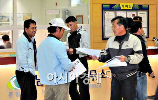 남북 당국자 실무자가 현 정부 들어 개성에서 처음으로 직접 접촉하기로 한 21일 경기도 파주 도라산 남북출입사무소를 통해 북측으로 출경하려는 개성공단 직원들이 긴장된 표정으로 출경 서류를 작성하고 있다.