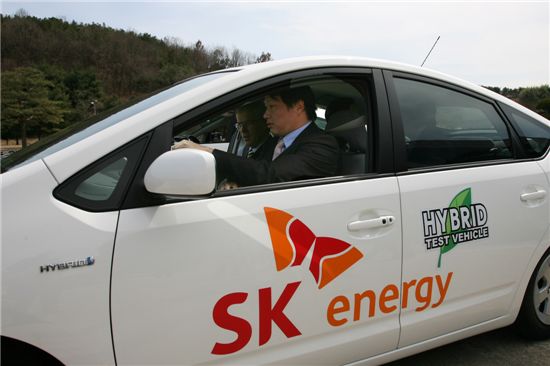 SK 최태원회장이 2008년 3월 기술원을 방문한 빙거먼 미 상원의원과 SK에너지가 개발 중인 하이브리드카배터리가 장착된 하이브리드카에 시승하고 있다.