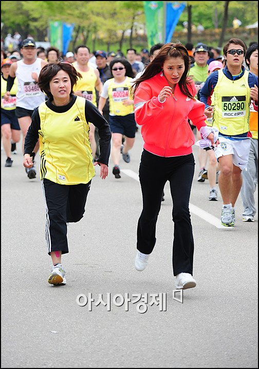 [아시아경제신문 박성기 기자]'무한걸스' 멤버 송은이와 황보가 26일 오전 9시 경기도 하남시 미사리경정장에서 열린 '2009 아디다스 MBC 한강마라톤'에서 역주하고 있다.