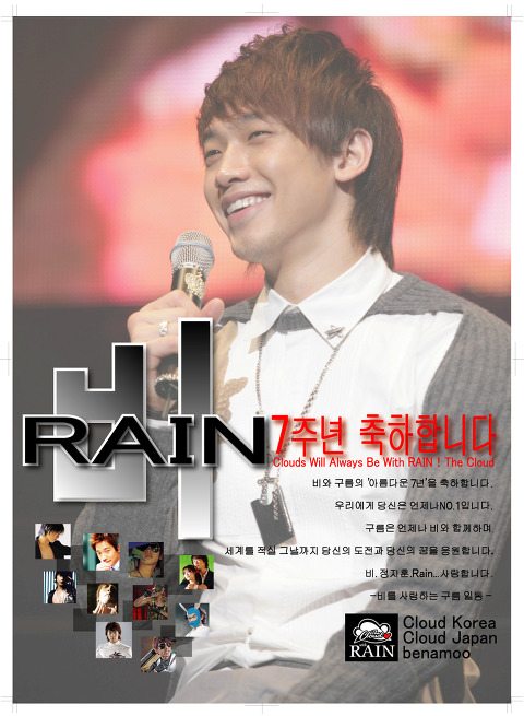 비의 공식 팬클럽 더클라우드(The Cloud)는 28일 데뷔 7주년을 맞는 비를 위해 전면광고를 실었고, 기부금을 모금했다.