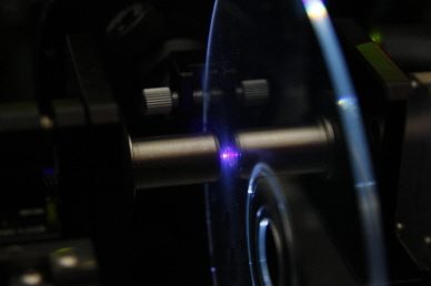 GE 마이크로 홀로그래픽 디스크에 겹친 푸른색 레이저가 홀로그램을 표시하고 있다