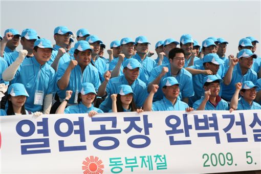한광희 동부제철 사장(두번째줄 오른쪽에서 네번째)과 임직원들이 파이팅을 외치며 열연사업의 성공을 위한 결의를 다지고 있다.