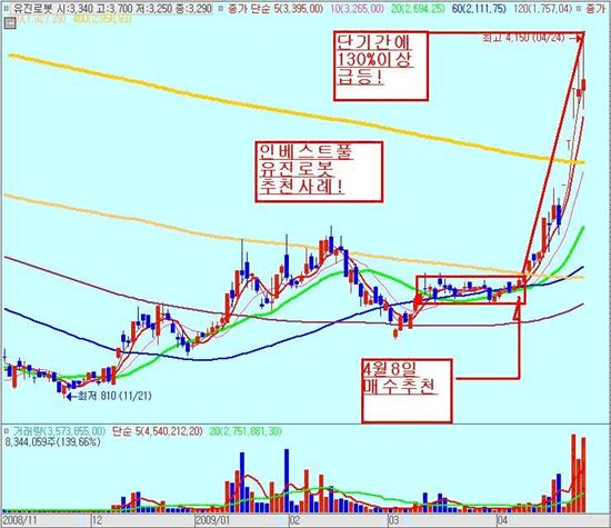 그동안 필자는 이러한 시장흐름을 예견했고, 정확한 시점에 유진로봇, SSCP 등을 추천드려 여러분들에게 단기간에 130%이상의 상승율을 보여 드렸다. 그러나 대부분의 개인 투자자는 화려한 겉 모습에 흥분하여, 뒤 늦은 투자로 세력들의 희생양이 되는 경우가 허다 하고, 낭패를 당하는 경우를 보면서 필자는 안타까움을 금치 못했다.
