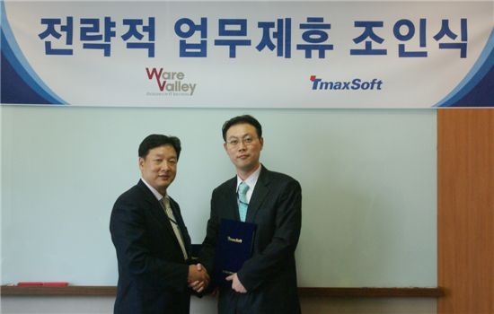 11일 허병근 티맥스소프트 전략마케팅본부 상무(왼쪽)와 김범 웨어밸리 전략사업본부 이사(오른쪽)가 티맥스소프트 본사에서 '데이터베이스 사업 상호협력에 관한 전략적 제휴'를 체결하고 있다.