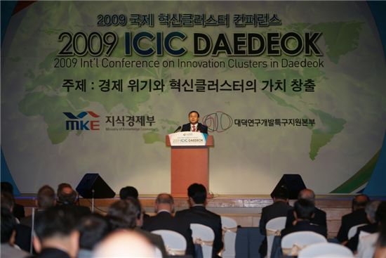 ‘2009 대덕특구 국제혁신클러스터 콘퍼런스(ICIC DAEDEOK)’가 12일 대전컨벤션센터에서 성대히 문을 열었다. 올해로 4회째를 맞는 이 행사는 ‘경제위기 시대와 혁신클러스터의 가치창출’이란 주제로 벨기에 필립 왕세자 등 세계 41개 나라 대사와 외교관, 혁신 클러스터 및 정부 관계자 등 660여명이 참가했다. 개막식에 참석한 지식경제부 임채민 차관은 환영사에서 “우리나라 최대 기술혁신 집적지인 대덕특구가 끊임없는 연구개발 투자와 시장창출을 통해 지금의 위기를 기회로 바꾸고 우리나라 경제 재도약의 밑거름이 될 것으로 믿는다”고 말했다.'혁신이론'에 대해 기조연설하고 있는 KAIST 서남표 총장