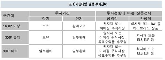 결국 900P 가입자의 경우 본인의 투자성향뿐만 아니라 시황전망도 고려해 가장 적극적으로 투자할 수 있는 투자자들이다. 또한 가입시기도 작년 하반기를 제외하면 대부분 2005년 이전에 가입했을 것이기 때문에 장기투자자라도 일부 환매를 고려할 수 있다. 단기투자자라면 환매를 통해 어느 정도 차익을 실현하는 것이 바람직할 것이며 투자상품의 선택은 투자성향에 따라 1300P대 가입자와 유사한 상품을 선택 할 수 있을 것이다.