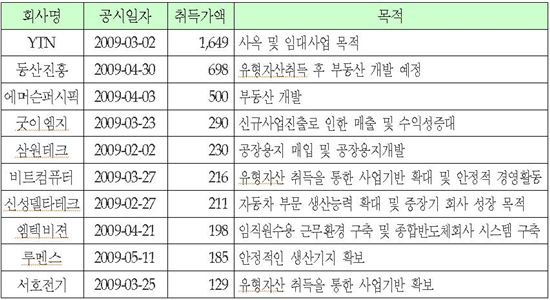 재무구조 개선과 운영자금 확보 등을 위해 유형자산을 처분키로 한 규모 또한 지난해 같은 기간보다 늘었다. 총 17개사가 8491억원 규모 보유 자산을 처분하겠다고 결정해 지난해 같은 기간의 3707억원보다 129% 증가한 것. 김연우 한양증권 애널리스트는 "보유 현금이 많고 사업이 잘되는 기업들은 부동산이 싸고 매물이 많을 때 취득하는 게 낫다고 판단해 유형 자산 취득에 나섰던 것"이라며 "반면 차입금이 많고 경영이 어려운 기업들은 재무구조 개선을 위해 보유 자산을 매각할 수밖에 없는 상황"이라고 말했다. 이번 조사는 유형자산 취득 및 처분결정 공시현황을 분석해 이뤄졌다. 상장기업들은 자산총액 10%이상의 유형자산을 사거나 파는 경우 공시하도록 규정돼있다.(자료제공-한국거래소, 단위-억원)