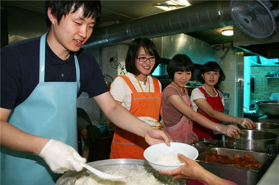LG파워콤 신입사원들이 영등포지역에서 독거노인들에게 무료급식을 배식하고 있다.<br />