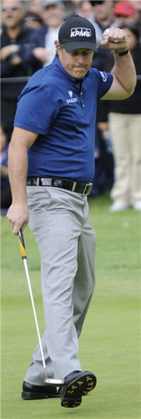 '넘버 2' 필 미켈슨(미국ㆍ사진)이 '3승 고지'를 향해 순항을 시작했다.미켈슨과 함께 '필드의 악동' 존 댈리(미국)가 6개월만에 복귀해 첫날부터 '구름갤러리'를 동원하고 있는 미국프로골프(PGA)투어의 세인트주드클래식(총상금 560만달러) 1라운드. 미켈슨은 4주간의 공백에도 불구하고 선두 브라이언 게이(미국)와 4타 차 공동 19위에 자리잡아 여전히 위력적인 샷을 과시했다. 댈리는 그러나 공동 96위로 밀려나 3라운드 진출도 만만치 않은 상황이다.미켈슨은 12일(한국시간) 미국 테네시주 멤피스 사우스윈드TPC(파70ㆍ7244야드)에서 개막한 세인트주드클래식(총상금 560만달러) 첫날 경기에서 버디 6개와 보기 2개, 더블보기 1개로 2언더파 68타를 쳤다. 아내 에이미의 유방암 선고로 지난달 중순부터 투어를 접었다는 점을 감안하면 일단 만족할만한 성적이다.전반을 이븐파로 마친 미켈슨은 특히 막판 7~ 8번홀의 연속버디로 기어코 언더파 스코어를 작성했다는 것이 자랑거리. 경기를 거듭할수록 아이언 샷의 날카로움이 살아나고 있어 2라운드가 더욱 기대되고 있는 상황이다. 에이미의 수술날짜가 이달말로 잡히면서 투어에 조기복귀한 미켈슨은 "잠시동안 골프에 몰두하겠다"면서 일단 다음 주 US오픈에 대비한 샷 감각 조율에 주력하는 모습이다.미켈슨으로서는 '골프황제' 타이거 우즈(미국)가 메모리얼토너먼트 우승으로 시즌 2승과 함게 상금랭킹 3위로 자신을 추월했다는 부분도 신경쓰이는 대목이다. 미켈슨은 "최근의 일들이 플레이에 악영향을 미치지는 않을 것"이라면서 "US오픈에서 우승한 뒤 에이미의 간병을 위해 한동안 투어에 나서지 않을 것"이라면서 US오픈 우승에 대한 강한 집념을 표명했다.게이에 이어 선두권은 지미 워커(미국)가 1타 차 2위(5언더파 65타)에서 추격전을 전개하고 있고, 유럽을 주무대로 활약하고 있는 호세 마리아 올라사발(스페인)이 공동 3위(4언더파 66타)로 모처럼 우승경쟁에 가세했다. 2003~ 2004년 이 대회 2연패의 주인공 데이비드 톰스(미국)도 공동 8위(3언더파 67타)에서 5년만의 정상탈환을 꿈꾸고 있다. 미켈슨과 함께 현지에서 최대관심사로 떠오른 댈리는 반면 버디 1개와 보기 3개로 2오버파를 치는 단촐한 스코어카드로 최하위권으로 처져 아직은 투어에 적응하지 못하는 모습이다. 댈리는 "퍼팅이 안됐다"고 아쉬워했다. '디펜딩챔프' 저스틴 레너드(미국) 역시 9~ 15번홀에서 7연속보기를 쏟아내는 난조로 무려 6오버파를 쳐 100위 밖으로 추락했다.김현준 골프전문기자 golfkim@asiae.co.kr<ⓒ세계를 보는 창 경제를 보는 눈, 아시아경제(www.asiae.co.kr) 무단전재 배포금지>