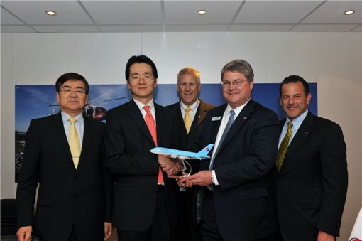 조양호 한진그룹 회장(왼쪽 첫번째)과 조원태 대한항공 여객사업본부장(왼쪽 두번째)이 15일(현지시각) 파리 에어쇼 행사장에서 토드 콜맨 상용엔진부문 프랫 앤 휘트니 사장(왼쪽 네번째)과 A330-200 성능 강화형 항공기에 장착할 PW4170 어드밴티지70 엔진 구매계약을 체결한후 기념촬영하고 있다.