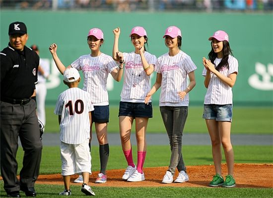 13일 부산 사직구장에서 '여고괴담5'의 네 주연배우가 백혈병 환우의 시구를 돕고 있다.