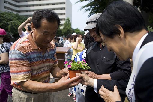 주흥남 아주산업 대표(오른쪽)가 화남아파트 주민에게 꽃화분을 전달하고 있다.<br />