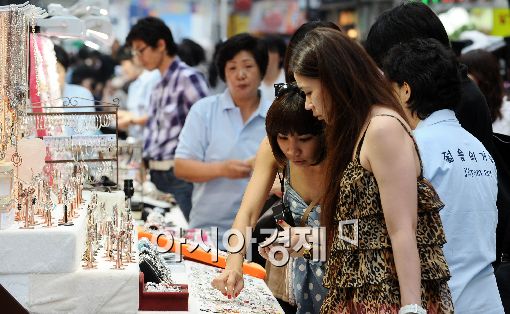 서울시가 '걷기편한 종로거리 만들기' 첫 시범사업으로 17일 종로구 관철동 '젊음의 거리'를 개장했다. 이날 오후 젊음의 거리 노점상에서 여성들이 액세서리를 고르고 있다.
