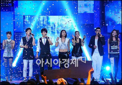 [아시아경제신문 박성기 기자]그룹 'VOS'(박지헌, 최현준, 김경록)가 18일 오후 7시 서울 마포구 상암동 DMC 누리꿈스퀘어에서 열린 Mnet(엠넷) 'M! CountDown'(엠카운트다운)'에서 1위를 차지한 후, 쥬얼리(박정아, 서인영, 하주연, 김은정)와 함께 축하무대를 꾸미고 있다.