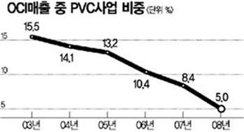 지난해 OCI전체 매출에서 PVC창호재가 차지하는 비중은 5%로 5년전15.5%를 기록한 이후 지속적으로 낮아지고 있다.