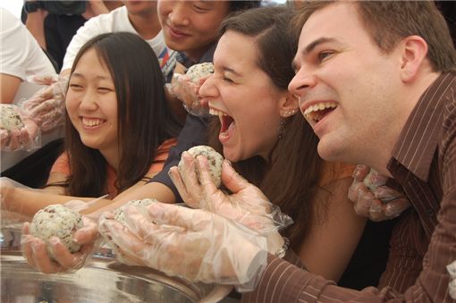 6.25를 이틀 앞둔 23일 오후 경기도 김포시 월곶면 다하누촌에서 열린 'We Love Peace(우리는 평화를 사랑합니다)' 행사에서 미국과 영국, 호주 등 참전국적의 외국인 유학생들이 한반도 모양의 초대형 주먹밥을 만든 뒤 시식을 하며 즐거워하고 있다.