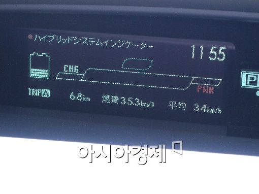 버튼 시동을 걸었지만 계기판에 불만 켜질 뿐 달라지는 것은 없다. 페달에 발을 얹자 스르륵 미끄러져나가는데 시동도 걸리지 않은 자동차가 움직이는 듯 해 신기하다. 소음은 물론 배기가스도 전혀 없다. 사실 이런 조용한 시동은 이미 렉서스의 하이브리드 모델을 시승하며 수 차례 경험한 바 있다. 그러나 프리우스의 탁월함은 고속 주행에서의 고연비를 실현한데 있다. 렉서스 하이브리드는 저속에서의 엔진 효율이나 정숙성을 이미 인정받았으면서도 고속도로 등 고속주행에서는 오히려 가솔린 모델이 미치지 못하는 연료 효율을 보여 사실상 친환경 측면에만 촛점을 맞춘 하이브리드 모델로 평가를 받아 왔다. 그러나 프리우스는 다르다. 전 모델에 비해 배기량을 200cc 올린 1800cc 하이브리드 엔진을 채택함으로써 고속 주행시 연비를 높였다. 트랙을 세 바퀴 주행하면서 최대한 가솔린 엔진 시동을 피하며 전기로 달렸다. 약 7km를 평균 34km/h로 달리면서 기자가 기록한 연비는 무려 35.3km/ℓ. 전기 주행이 계속돼 배터리 충전상태가 낮아지면 가솔린 엔진이 자동 작동돼 충전하며 그 이후에는 다시 전기로 달릴 수 있다. 도심 출퇴근 시에는 경쟁상대가 없을 정도의 효율성이다.기자가 기록한 실제 연비. 액정 디스플레이는 시인성이 좋고 깔끔하다.