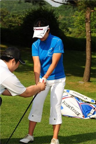 여성골퍼들이 남성에 비해 가장 비교되는 부분이 바로 '장타'다. 골프에서 시원하게 뻗어나가는 드라이브 샷만큼 짜릿한 쾌감을 주는 것도 없다. 대부분의 여성골퍼들은 그러나 이런 맛을 모르고 라운드를 한다. 신체적으로 힘이 약한 것도 있지만 클럽을 휘두르는 감각이 상대적으로 떨어지기 때문이다. 하지만 정확한 스윙의 메카니즘만 익히면 여성골퍼들도 남성 못지 않은 비거리를 낼 수 있다. ▲ 그립이 출발점이다= 모든 샷이 그렇듯 장타 역시 그립부터 점검해야 한다. 장타를 위한 그립은 일단 스트롱그립(훅그립)이다. <사진1>처럼 왼손등의 손가락 마디가 3개 정도 보일 수 있도록 오른쪽으로 돌려잡는다. 오른손 역시 스퀘어그립보다 조금 오른쪽으로 돌린다. 이렇게 하면 강한 임팩트와 함께 클럽의 헤드를 감아주는 롤링 동작이 보다 원활하게 이뤄진다. 다음은 유연함이다. 부드러움이 곧 강함이라는 말도 있다. 경직된 몸을 풀어주라는 이야기다. 어드레스 자세를 취한 후 클럽을 앞 뒤로 몇번 흔들어주는 왜글동작은 어깨나 팔근육의 긴장을 풀어주는 준비자세다. 이때 단순히 연습스윙을 반복만 할 게 아니라 그립의 힘을 빼 헤드 무게를 느낄 수 있어야 한다. 그래야 클럽을 '확 뿌리는' 스윙을 할 수 있다. 바람속에서는 요령도 있어야 한다. 만약 맞바람이 불고 있다면 바람의 영향을 덜 받는 낮은 탄도의 샷을 위해 볼 위치를 평소(왼발 뒷꿈치와 일직선)보다 약간 우측에 두는 것도 방법이다. 티도 볼 반개 정도 낮게 꽂는다. 볼을 우측에 뒀기 때문에 타깃보다 좀 더 왼쪽 지점을 겨냥한다. 이렇게하면 보다 낮은 탄도로 볼이 날아가면서 상대적으로 많이 굴러가게 된다.[사진2] 다운스윙에서 코킹을 끝까지 유지해야 힘을 최대한 끌어모을 수 있다.