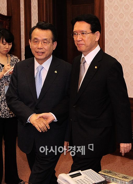 30일 오후 서울 여의도 국회에서 김형오(오른쪽) 국회의장과 한승수 국무총리가 만나 인사를 나누고 있다.
