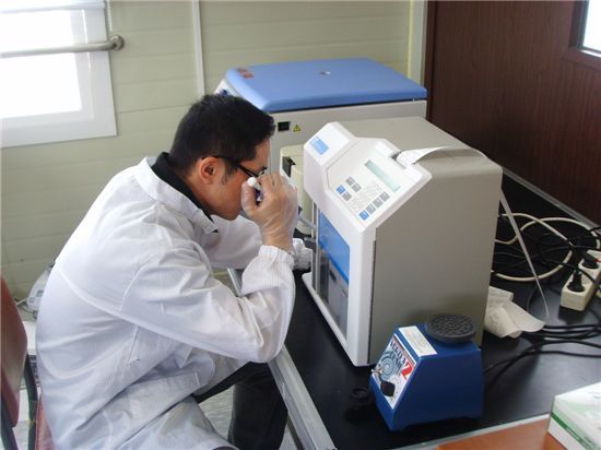 아이소텍 연구진이 혈당측정기의 성능개선을 위해 실험을 벌이고 잇다.