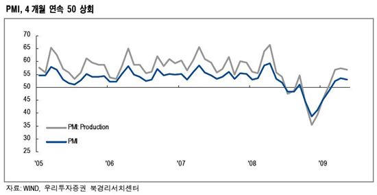 주희곤 애널리스트는 "올해 상반기 상황을 보면 중국의 경기회복세가 형성된 것으로 판단된다"며 "향후 제조업 경기 확장세는 지속될 전망"이라고 밝혔다. 통상 PMI가 50을 상회하면 경제 확장, 50을 하회하면 경제 위축을 의미한다.