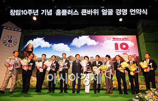 창립 10주년을 맞이한 홈플러스가 6일 오후 서울 중구 장충동 신라호텔에서 고객,협력사와 각계 인사 등 600여명을 초대해 '큰 바위 얼굴 경영 언약식'이라는 타이틀로 창립 10주년 행사를 가졌다. 홈플러스 패스트 페밀리 우수 상품 협력사 수상자들이 이승환 회장과 수상을 마친후 기념 촬영을 하고 있다.윤동주 기자 doso7@asiae.co.kr<ⓒ세계를 보는 창 경제를 보는 눈, 아시아경제(www.asiae.co.kr) 무단전재 배포금지>