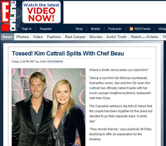 E!온라인에 보도된 킴 캐트럴 결별 기사 [사진=E!온라인 캡쳐]