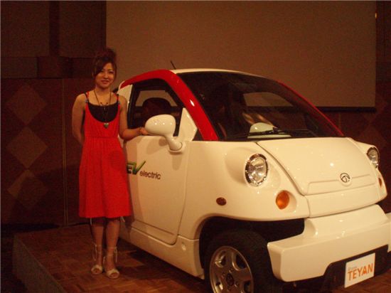 CT&T가 최근 일본 수출에 성공한 자사 전기차 'e존'. 지난 13일 일본에서 열린 미디어행사에서 홍보모델이 e존을 배경으로 포즈를 취하고 있다.