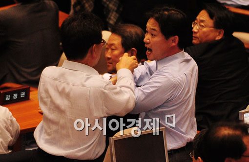 22일 오후 국회 본회의장에서 신지호 한나라당 의원이 미디어법 관련 투표를 하는 도중 몸싸움을 하고 있다.윤동주 기자 doso7@asiae.co.kr<ⓒ세계를 보는 창 경제를 보는 눈, 아시아경제(www.asiae.co.kr) 무단전재 배포금지>