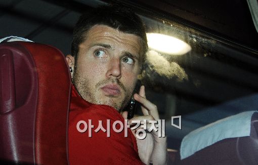 22일 오후 인천국제공항을 통해 입국한 마이클 캐릭 선수가 버스 안에서 전화 통화를 하고 있다.3박4일 일정으로 방한한 맨체스터 유나이티드 선수단은 장충동 신라 호텔에서 머물며, 24일 서울 월드컵경기장에서 FC서울과 화끈한 맞대결을 펼친다. 이재문 기자 moon@asiae.co.kr<ⓒ세계를 보는 창 경제를 보는 눈, 아시아경제(www.asiae.co.kr) 무단전재 배포금지>