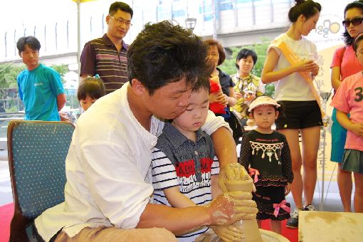 지난 7월초 롯데백화점에서 열린 옹기제작 시연회에서 옹기문화엑스포조직위원회 관계자가 어린이와 함께 물레를 돌리며 옹기제작을 돕고 있다.