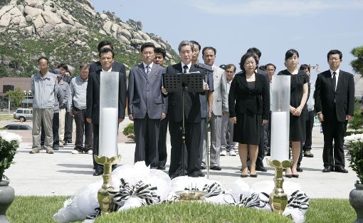 현정은 현대그룹 회장과 조건식 현대아산 사장, 정지이 전무 등 임직원들이 4일 금강산 온정각에서 故정몽헌 회장 추모행사를 진행하는 모습