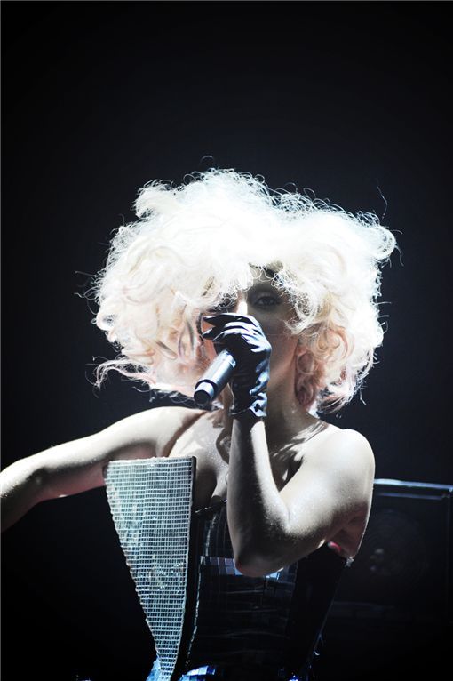 [아시아경제신문 고경석 기자]'제2의 마돈나'로 불리는 미국의 팝스타 레이디 가가가 다시 한 번 파격적인 패션을 선보이며 열정적인 무대로 4000여 한국 팬들을 사로잡았다. 지난 6월 16일 2박3일 일정으로 내한 프로모션 행사를 가진 바 있는 레이디 가가는 9일 오후 8시 15분께 20분에 걸친 이정현의 오프닝 공연에 이어 무대에 올라 국내 팬들과 두 번째로 만났다. 영화 오프닝을 연상케 하는 동영상에 이어 무대 위로 오른 레이디 가가는 팝아트에 가까운 의상을 입고 '파파라치(Paparazzi)'를 열창했다. 하드록에 가까운 키타(Keytar, 기타 모양의 키보드) 연주로 '파파라치'를 마무리한 레이디 가가는 '손을 들어올려요! 한국'이라고 외치며 '러브게임(LoveGame)'으로 공연의 열기를 이어갔다. 열정적인 춤으로 '러브게임'을 끝낸 레이디 가가는 우리말로 "안녕하세요! 한국"이라고 소리친 뒤 "서울에 오게 돼 너무 흥분된다. 오늘 공연은 아주 중요한 쇼다. 왜냐면 당신들이 누구이건, 어디서 왔건, 호주머니에 얼마나 돈이 있건 우린 모두 아름답고, 더럽고, 부자(beautiful, dirty, rich)이기 때문이다"라는 위트 넘치는 멘트로 다음곡 '뷰티풀, 더티, 리치(Beautiful, Dirty, Rich)'를 예고했다. 동영상 클립 상영과 함께 잠시 자리를 비운 레이디 가가는 의상을 갈아입고 오토바이에 오른 채 재등장해 데뷔앨범 타이틀곡 '더 페임(The Fame)'을 열창했다. 레이디 가가는 여러 차례 '한국'을 외치며 우리말로 '안녕하세요'에 멜로디를 붙여 부르는 등 팬서비스를 잊지 않았다.레이디 가가가 9일 오후 8시 서울 송파구 올림픽공원 올림픽홀에서 열린 자신의 첫 내한공연 무대에 올라 열창하고 있다. [사진=엑세스엔터테인먼트]