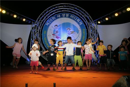 지난 15일 대우조선해양 후원으로 거제시 명사해수욕장에서 열린 ‘새 생명의 밤, 바다축제’ 행사에서 백혈병 어린이들이 장기자랑을 뽐내고 있다.