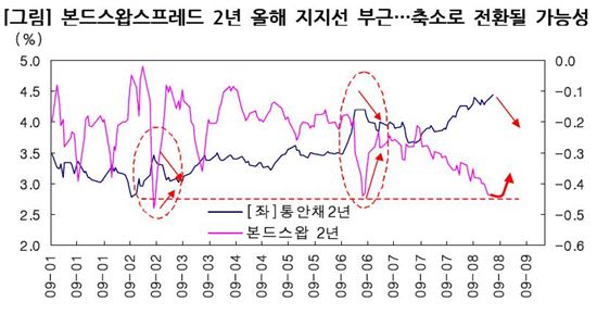 <예상레인지> 109.30~109.80통안채 2년 추가 강세 여부 주목. 절대금리 메리트 기댄 일부 매수세 유입된 듯. 여기에 2년구간 본드스왑스프레드 마이너스 폭도 매력적으로 보임. 마이너스 45bp 수준으로 올들어 지지선 부근. 특히 3, 5년 본드스왑 스프레드와 비교했을 때 스프레드 상당히 과한 편. 스프레드 축소 국면으로 접어든다면 통안채 2년 강세 이어질 가능성 있다는 판단. 외국인 매수와 관련해서는 6월말~7월초 외국인 매매동향과 챠트 참고. 20일 이평성 하방향, 횡보양상 등이 지금과 유사. 다만 횡보양상속에서 20일 이평 안착되는 흐름 보이면서 외국인 매수에 가속도 붙었던 경험. 7월초 결국 만연한 박스권 인식에도 불구하고 외국인 매수에 박스상단 갭업으로 돌파했음. 어차피 재료보다는 챠트 영향이 큰 외국인 매매동향을 감안했을 때 이번에도 비슷한 양상될 가능성에 무게.미국 소비, 주택가격 지표는 급호전. 다만 주식은 강보합 정도만, 국제유가는 급락. 경제지표 호전에도 조정받는 국면. 오히려 미국채 금리 하락한 것이 호재로 영향을 미칠 전망. 통안채 2년 강세 이어간다면 새로운 모멘텀 될 수 있어. 20일 이평 안착국면에서 외인 매수 역시 단발성은 아닐 것으로 판단. 박스권 인식 견고하지만 반사적으로 상단 뚫리면 상승탄력 언제든지 강화될 수 있단 것 유념. 월말지표에 대한 부담 있을 수 있지만 서프라이즈만 아니면 불확실성 해소에 포지션 늘리겠단 대기매수 관점 보이는 것도 우호적. 사실 6월만큼의 급격한 경기호전을 7월 바라는게 무리란 것은 주지의 사실일 것임. 또 단기물로 금리인상 이미 상당부분 반영했단 것도 감안. 박스권 상단인 60선 상향돌파 염두에 둔 대응이 바람직할 것으로 판단.◇ 통안채 2년 매기 형성되나…절대금리 메리트에 2년 본드스왑 스프레드 축소 가능성 = 원래 박스권 전망이 가득할 때 시세는 치고 나갔다. 이번에도 그런 양상이 될 가능성이 있다고 본다. 여전히 시세 박스권 상단돌파 가능성이 있는 것으로 판단한다. 특히 단기물쪽에서도 모멘텀이 나오고 있단걸 주시할 필요가 있는 시점이다.전날은 통안채 2년이 다소나마 고개를 드는 모습이다. 일부 절대금리 메리트관련 저가매수가 있었던 것으로 보인다. 여기에 한가지 더 주목해야 할 것은 2년 본드스왑스프레드. 마이너스 45bp 수준이다. 올들어 2년 본드스왑스프레드 지지선까지 온 것. 아래그림을 보면 알겠지만 올들어 이정도 수준에선 지지받으며 여지없이 본드스왑스프레드 폭을 줄였던 것을 관측할 수 있다. 이번에도 역시 비슷한 양상이 될 가능성이 있어 보인다. 본드스왑관련해서도 통안 2년 구간에 매기가 생긴 것으로 본다.