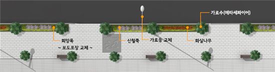 여성들의 하이힐이 보도 블럭 사이에 끼이는 것을 방지하는 등 보행인이 한층 여유롭고 안전한 거리에서 공원을 산책하는 듯한 쾌적함을 느낄 수 있도록 설계했다. 더불어 통상적으로 보도를 교체하더라도 예산부족으로 손을 댈 수 없었던 건축후퇴선 부분 보도까지 칼라 포장하기로 했다. 이와 함께 그동안 잘 사용되지 않던 지하철 환풍구와 환풍구 사이, 지하보도 출입구와 출입구 사이에 포켓공원과 구간별 띠 녹지를 조성하기로 했다. 이 곳에 회양목 산철쭉 화살나무 등을 심고 벤치를 설치해 휴식과 머무는 공간으로 탄생된다.또 서울시 디자인 표준안을 적용한 휴지통을 비롯해 맨홀 뚜겅, 자전거 보관대, 수목보호대를 새로 설치하고 기존에 난립하던 사설안내표지판은 가로등과 통합해 깔끔하게 정리한다.이외도 기업형 노점상에 대한 단속을 강화하고 무질서하게 난립한 노점상을 재배치해 규격화하고 시간제, 실명제 등을 도입·적용하는 방안도 추진할 계획이다.위치도