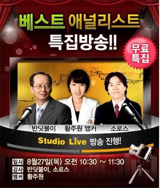 수익률 TOP전문가가 제시하는 투자 전략, "업종별, 종목별로 대응하라"이에 바닥권 급등주 발굴의 1인자 '반딧불이'와 편안한 고수익 스윙매매의 국내 최강자 '소로스'는 "종합주가지수에 초점을 맞추기 보단 업종별, 종목별로 대응을 강화해 수익률을 극대화 시켜야 할 것"이라며 "이러한 측면에서 현 장세의 대응전략과 고수익 포인트를 공개하는 무료특집방송을 진행할 예정이다"고 밝혔다.이번 무료특집방송은 하이리치가 추천주를 통한 수익현황과 회원평가 등을 바탕으로 최고의 누적수익을 달성한 주간 베스트 애널리스트 1∼3위 전문가를 선정해 실시하는 특별방송의 일환으로, 27일 오전 10시 30분~11시 30분까지 스튜디오 라이브방송으로 진행된다.8월 넷째 주 부자 되는 증권방송 하이리치(www.hirich.co.kr) 베스트 애널리스트 2위에 오른 '반딧불이'는 하이닉스(5.82%), 삼화콘덴서(4.62%), LG생명과학(3.35%) 등으로 13%가 넘는 누적 수익을 거뒀으며, '소로스'는 같은 기간 일공공일안경 단일 종목만으로 13.87%의 고수익을 확보해 3위에 선정됐다.