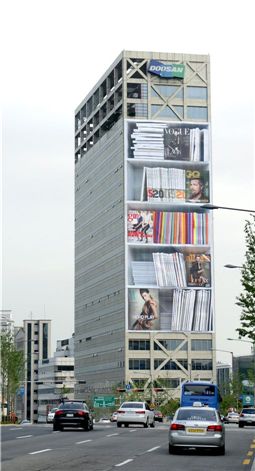 서울 논현동 두산빌딩에 설치된 두산매거진 초대형 현수막 광고