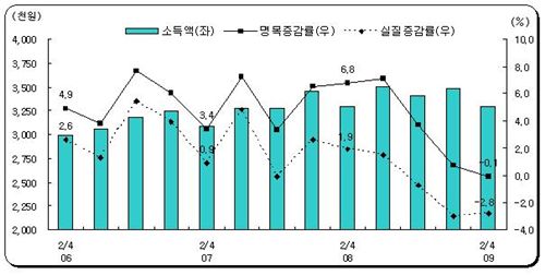 기획재정부와 통계청이 28일 발표한 '2009년 2·4분기 가계동향' 및 분석 자료에 따르면, 올 2·4분기 2인 이상 전국가구의 가구당 월평균소득은 329만9000원으로 전년 동분기대비 0.1% 감소했다. 통계청이 전국 단위로 관련 통계를 작성하기 시작한 지난 2004년 이래로 명목소득이 처음 감소한 것이다.물가상승률을 반영한 실질소득도 2.8% 줄어들었다.또 월평균 소비지출은 207만1000원으로 전년 동기에 비해 1.4% 늘면서 5분기 만에 상승세로 전환됐지만, 실질소비는 1.1% 감소했다.실질소득과 실질소비 증가율은 지난해 4·4분기 각각 전년 동기대비 -1.5%와 -3.1%를 기록한데 이어, 올 1·4분기에도 -3.0%와 -6.8%를 나타냈다. 특히 2·4분기 기준으로 실질소득과 실질소비가 모두 감소한 건 이번이 처음이다.전국가구 가구당 월평균 소비지출 및 전년동기비 추이 (자료: 통계청)