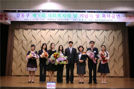 지난해 열린 사회복지의 날 기념식에서 이해식 구청장이 수상자들과 함께 기념 사진을 찍고 있다.