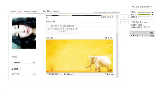 [아시아경제신문 고경석 기자]최근 가수 전진과 이별한 배우 이시영이 자신의 심정을 미니홈피에서 간접적으로 밝혀 화제다. 이시영은 최근 자신의 미니홈피 제목으로 '뼈저리게' 혹은 '뼛속까지 사무치는'이라는 뜻의 'To the bone'을 쓰고, 투우의 마지막 단계로서 죽기 직전의 소를 연속해서 찌르는 행위를 뜻하는 '파에나(faena)'를 머리글에 적으며 심경을 우회적으로 드러냈다. 또한 미니홈피 하단부에는 '괜찮아'라는 제목과 함께 묵묵히 걷고 있는 코끼리의 모습을 담았다. 이시영은 자신의 미니홈피에서 전진과 관련한 사진을 전부 삭제해 심적인 변화가 매우 컸음을 간접적으로 내보였다. 이에 네티즌들은 이시영의 미니홈피에 "이젠 잊고 힘내서 열심히 살라" "얼른 기운 차리기 바란다. 응원하겠다" "더 좋은 인연을 위한 것일 거다. 힘내라" 등의 격려가 담긴 글을 연이어 올리고 있다. 고경석 기자 kave@asiae.co.kr<ⓒ아시아경제 & 스투닷컴(stoo.com)이 만드는 온오프라인 연예뉴스>