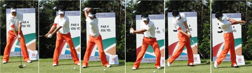 일본열도를 뜨겁게 달구고 있는 이시카와 료(18).이시카와는 고교 1학년 당시인 2007년 일본프로골프투어 먼싱웨어오픈에서 최연소우승(15세 245일)을 차지해 순식간에 일본골프계의 희망으로 떠오른 선수다. 수려한 외모에 300야드에 육박하는 장거리포로 공격적인 플레이를 즐겨 일본에서는 '캐릭터상품'까지 출시할 정도로 폭발적인 인기를 얻고 있다.이시카와는 지난 7월 브리티시오픈에서는 '골프황제' 타이거 우즈(미국)와 동반플레이를 펼치면서도 매 홀 드라이버를 때리고, 핀을 직접 노리는 거침없는 플레이로 더욱 스포트라이트를 받았다. 이시카와는 특히 173㎝에 68㎏의 크지 않은 체격에도 불구하고 언제나 장타를 과시해 아마추어골퍼들에게는 선망의 대상이다. 이시카와의 장타는 <사진>처럼 넓은 스탠스가 출발점이다. 이렇게 하면 하체를 단단하게 고정시키는 동시에 체중이동을 원활하게 진행할 수 있다. 테이크 어웨이와 백스윙은 스윙아크를 최대한 크게 만드는데 초점을 맞추고 있다. 다운스윙과 임팩트에서는 왼쪽 다리를 벽으로 삼아 온 몸을 내던지는 듯한 강력한 동작으로 헤드스피드를 최대화한다.이시카와는 실제 10일 충남 천안 우정힐스골프장에서 개막한 '내셔널타이틀' 한국오픈(총상금 10억원) 첫날 1번홀에서 330야드에 달하는 호쾌한 드라이브 샷을 뿜어내 갤러리의 찬사가 쏟아졌다.이시카와의 스윙을 지켜본 전문가들은 상체의 완벽한 꼬임이 돋보이는 등 장타를 위해 이상적인 스윙을 구사한다고 입을 모았다. 이시카와는 장타의 비결에 대해 "스윙아크를 최대한 가져가는 것"이라면서 "이를위해 경기전 충분히 몸을 풀어야 실전에서 몸을 더 많이 회전할 수 있다"고 말했다.김현준 골프전문기자 golfkim@asiae.co.kr<ⓒ세계를 보는 창 경제를 보는 눈, 아시아경제(www.asiae.co.kr) 무단전재 배포금지>